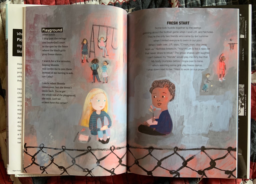 The authors did an amazing job creating these poems and how well the poems demonstrated two completely different lifestyles. There were also many issues that are still being faced in the world today that are in incorporated into the poems like race and stereotypes. The illustrators also did a fantastic job creating the illustrations in the book. One of my favorite is when the girl and the boy are talking to one another in class on page 35 and the illustrators chose to have flowers bloom from their mouths. The poem is also called “Blooming Flowers” and the illustration represents the title well.
