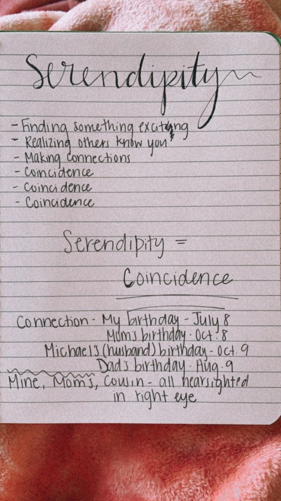 In the book, she begins to write about the word Serendipity and what it means. Serendipity means realizing the connections you have with others, finding something exciting, and especially the coincidences. Coincidences is what she focused on the most when describing serendipity. I loved reading the serendipity moments she had and it made me think of a few I have myself. One of them being the way mine and my husband’s birthdays connect to my parents. My birthday is on July 8 and my mom’s is on October 8. My husband’s is on October 9 and my dad’s is on August 9. Another is me, my mom, and my cousin are all nearsighted in the same eye (the right) and have perfect vision in the other (the left).