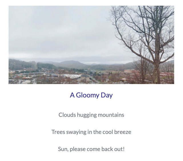 Published Poetry Six Senses Poem Observational Poetry After Valerie Worth So Much Depends Upon After William Carlos Williams Haiku/Photoku Animal Poetry Share this: Share on X (Opens in new window) X Share on Facebook (Opens in new window) Facebook Like Loading...